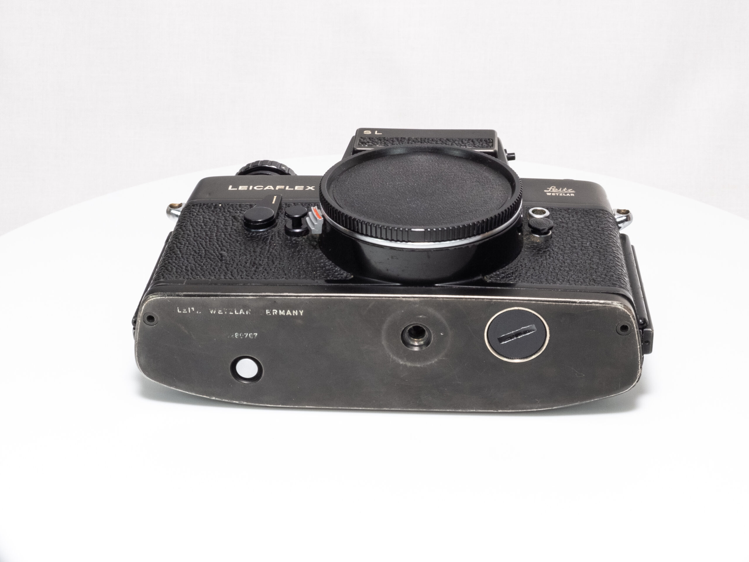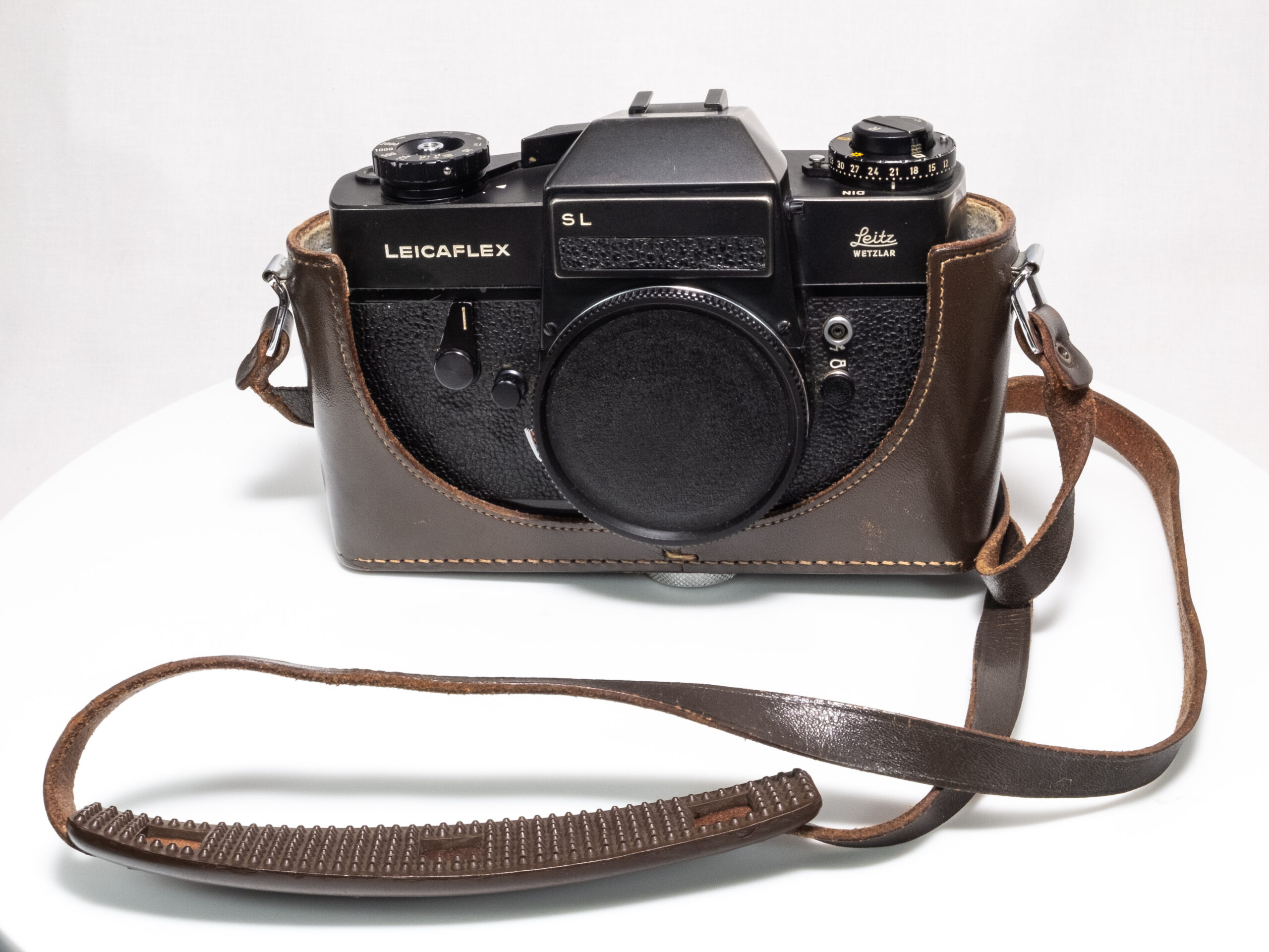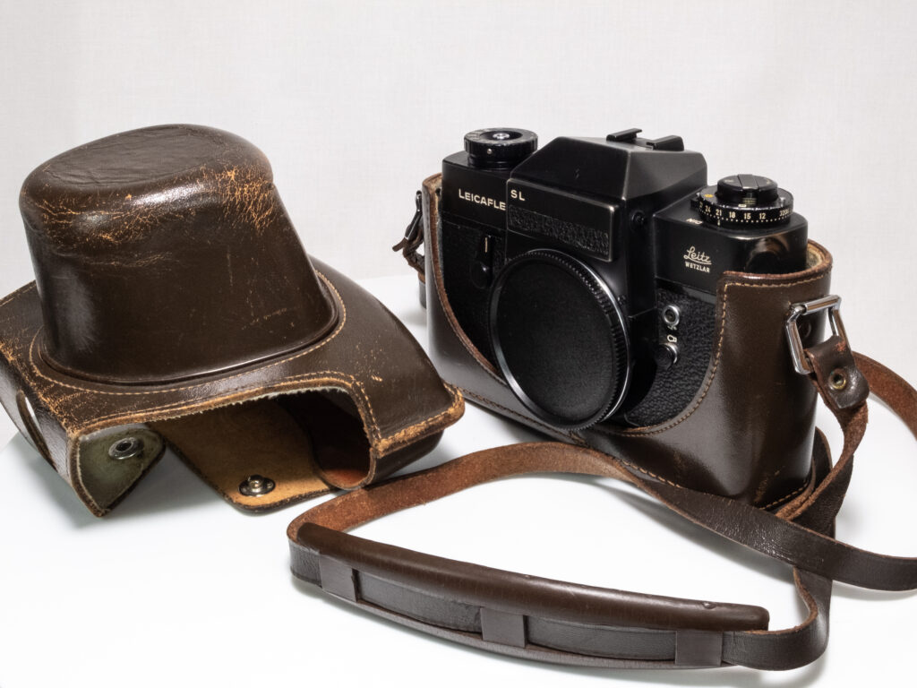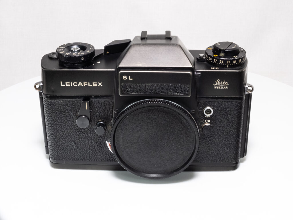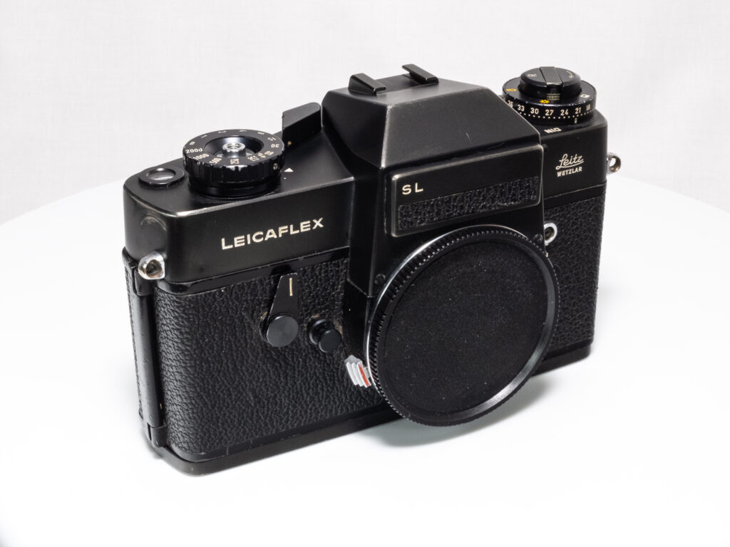 Die Leicaflex SL in schwarzem Chromfinish wurde 1971 von Leitz (Leica) produziert und ist eine robuste, vollständig mechanische Spiegelreflexkamera für 35-mm-Film. Die Kamera bietet eine selektiv messende TTL-Belichtungsmessung und ist für das Leica R-Bajonett ausgelegt. Das Gehäuse ist aus Metall gefertigt und zeichnet sich durch seine präzise Verarbeitung und hohe mechanische Zuverlässigkeit aus. Die schwarze Verchromung war seltener als das silberne Modell und ist heute insbesondere bei Sammlern von Interesse.