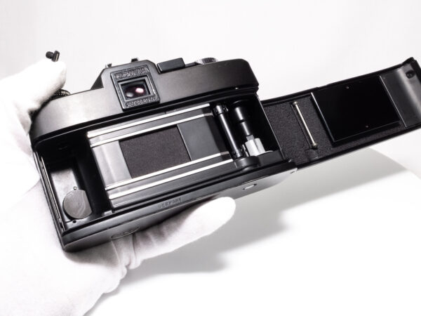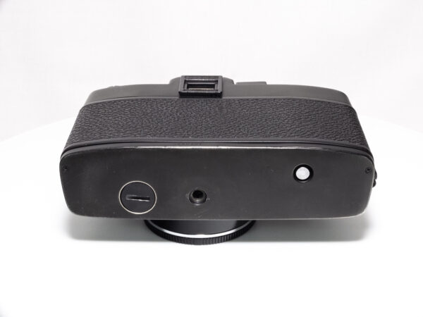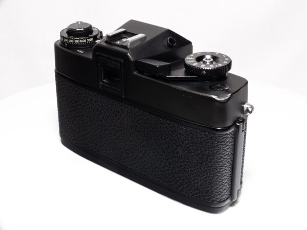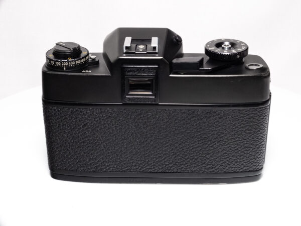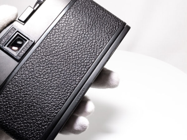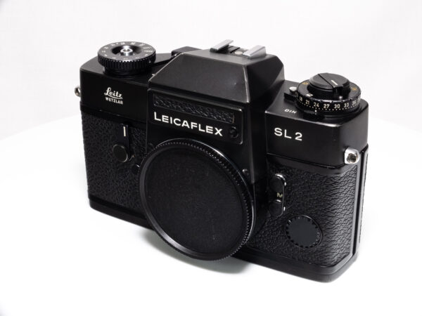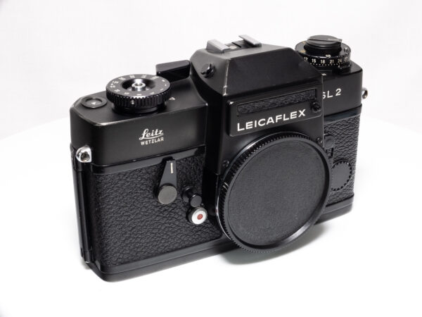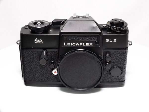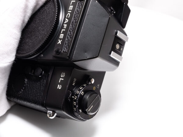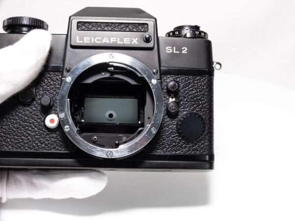 OHNE SERIENNUMMER. Sehr seltene Leicaflex ohne Seriennummer, wahrscheinlich nach dem Ende der offiziellen Produktion aus Restbeständen produziert. Demnach frühestes Produktionsjahr 1976. Nach Einschätzung der Leica-Classic-Store Mitarbeitern in Wetzlar keine Vorserie, da auch diese eine Nummerngravur aufweisen. Alle serienmäßig produzierten Leicaflex SL2 weisen eine Seriennummer im hinteren Bereich der Bodenplatte auf.