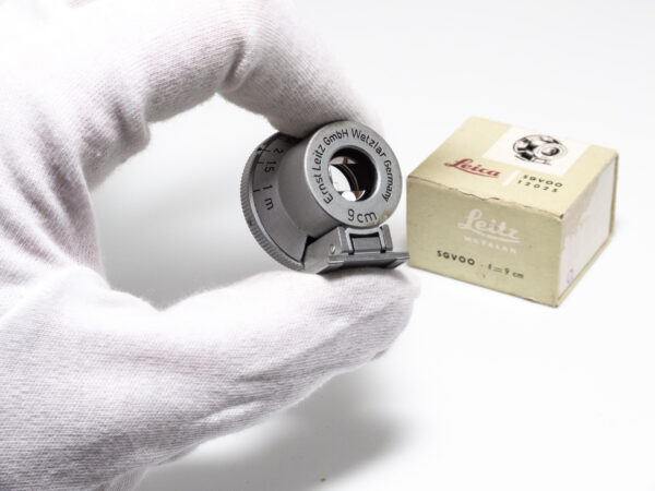 Der Leica SGVOO (Leitz-Nr. 12015) ist ein externer optischer Aufstecksucher, der für die Nutzung mit 9-cm-Objektiven (entspricht 90 mm) an Leica Messsucherkameras konzipiert wurde. Er wird in den Zubehörschuh der Kamera eingesetzt und bietet einen parallaxkorrigierten Bildausschnitt, der das Bildfeld des verwendeten Objektivs abbildet. Dies ist insbesondere bei älteren Kameramodellen ohne integrierte Rahmenlinien für 90 mm hilfreich.