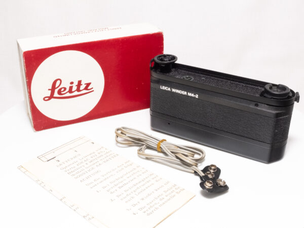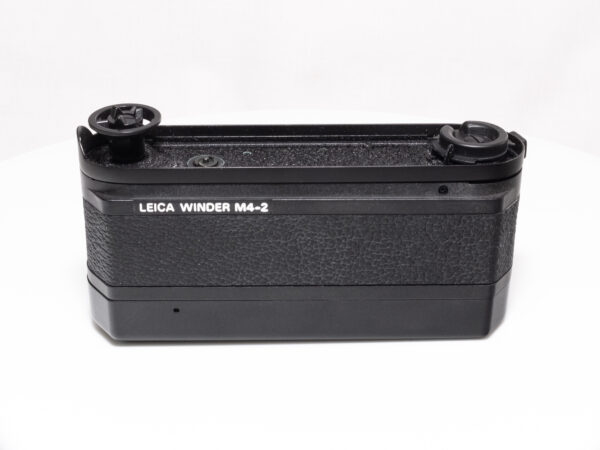 Der LEICA M4-2 Winder ist ein motorischer Filmtransport für die analoge Messsucherkamera Leica M4-2. Er ermöglicht den automatisierten Filmtransport und vereinfacht so das Arbeiten in schnellen Aufnahmesituationen, wie etwa in der Reportagefotografie. Der Winder wird anstelle der Bodenplatte montiert und bezieht seine Energie aus zwei AA-Batterien. Er bietet Einzelbild- und Serienaufnahmen (ca. 2 Bilder pro Sekunde) und erhöht das Gewicht der Kamera nur moderat.