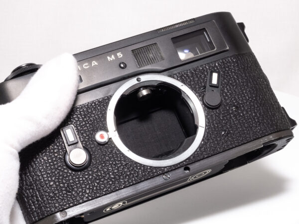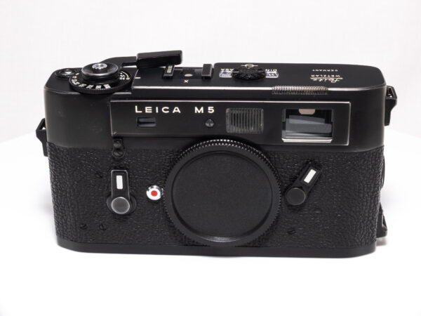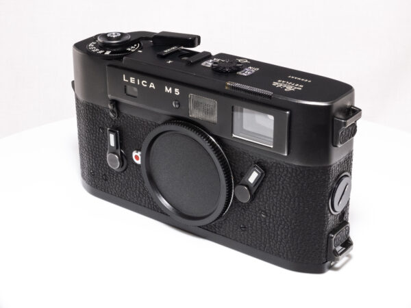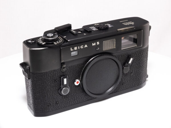 Die Leica M5 ist eine Messsucherkamera mit Belichtungsmessung, die von 1971 bis 1975 produziert wurde. Sie war die erste Leica M mit eingebautem Belichtungsmesser und bietet eine größere, ergonomisch verbesserte Bauweise im Vergleich zu ihren Vorgängern. Die „3-Plug“-Version von 1972 zeichnet sich durch drei Riemenösen aus, die eine flexiblere Trageweise ermöglichen.
