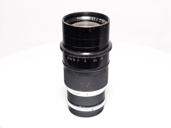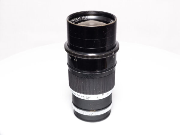 Das LEICA Telyt 20cm F4.5 in Schwarz mit LTM-Anschluss (Leica Thread Mount, M39) ist ein klassisches Teleobjektiv aus der frühen Leica-Ära. Es wurde für den Einsatz an Schraubkameras konzipiert und bietet eine lange Brennweite bei moderater Lichtstärke, ideal für Aufnahmen aus größerer Distanz. Der rein manuelle Aufbau und die kompakte Konstruktion machen es zu einem interessanten Objektiv für Sammler und Anwender klassischer Messsucherkameras mit optionalem Visoflex-System.
